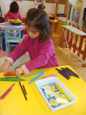 No grupo 4 do JI de Meãs, chegou a hora de arrumar e a Lara arrumou os lápis. A Leonor também quis e arrumou as canetas.