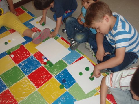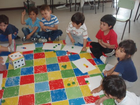 Cada criança jogava o dado e tinha que colocar as tampinhas correspondentes ao número de pintas do dado. No final do jogo víamos quem tinha ficado com mais tampinhas.