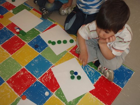A propósito das tampinhas que o Sérgio trouxe para a sala 1 do JI de Meãs, realizámos jogos matemáticos com o objetivo de desenvolver o processo de construção do conceito de número.