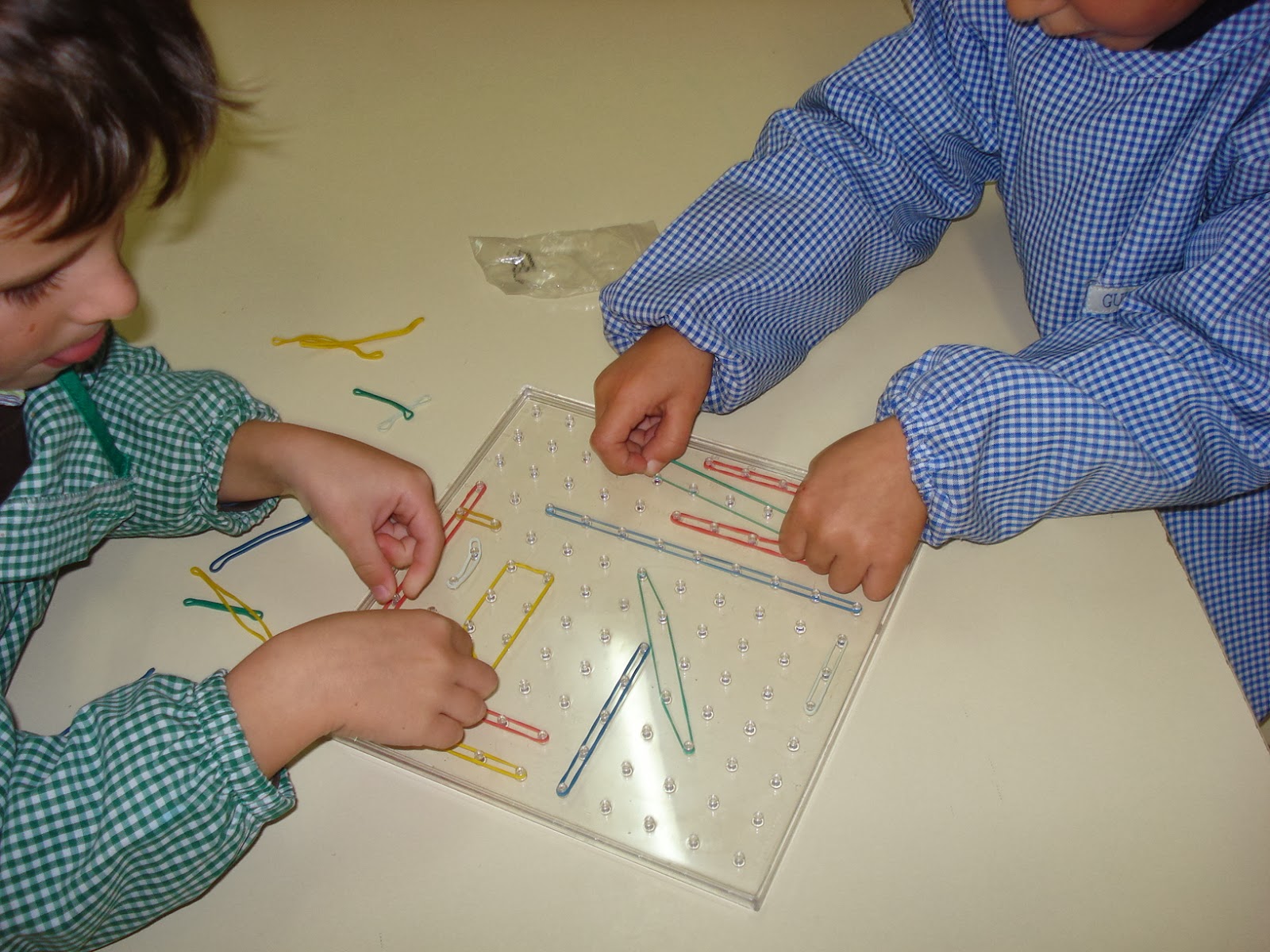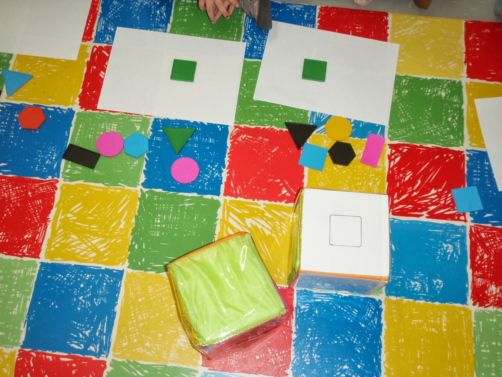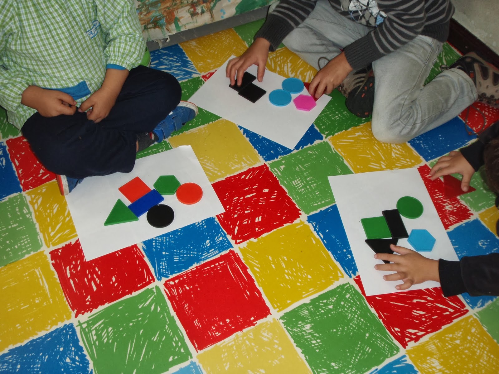 Cada criança tinha 6 peças geométricas de diferentes cores.