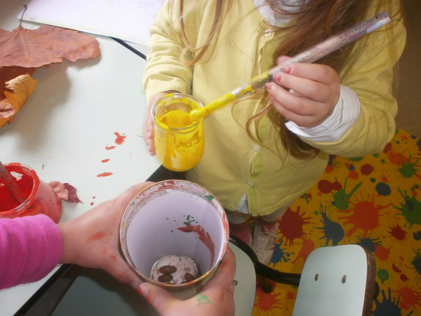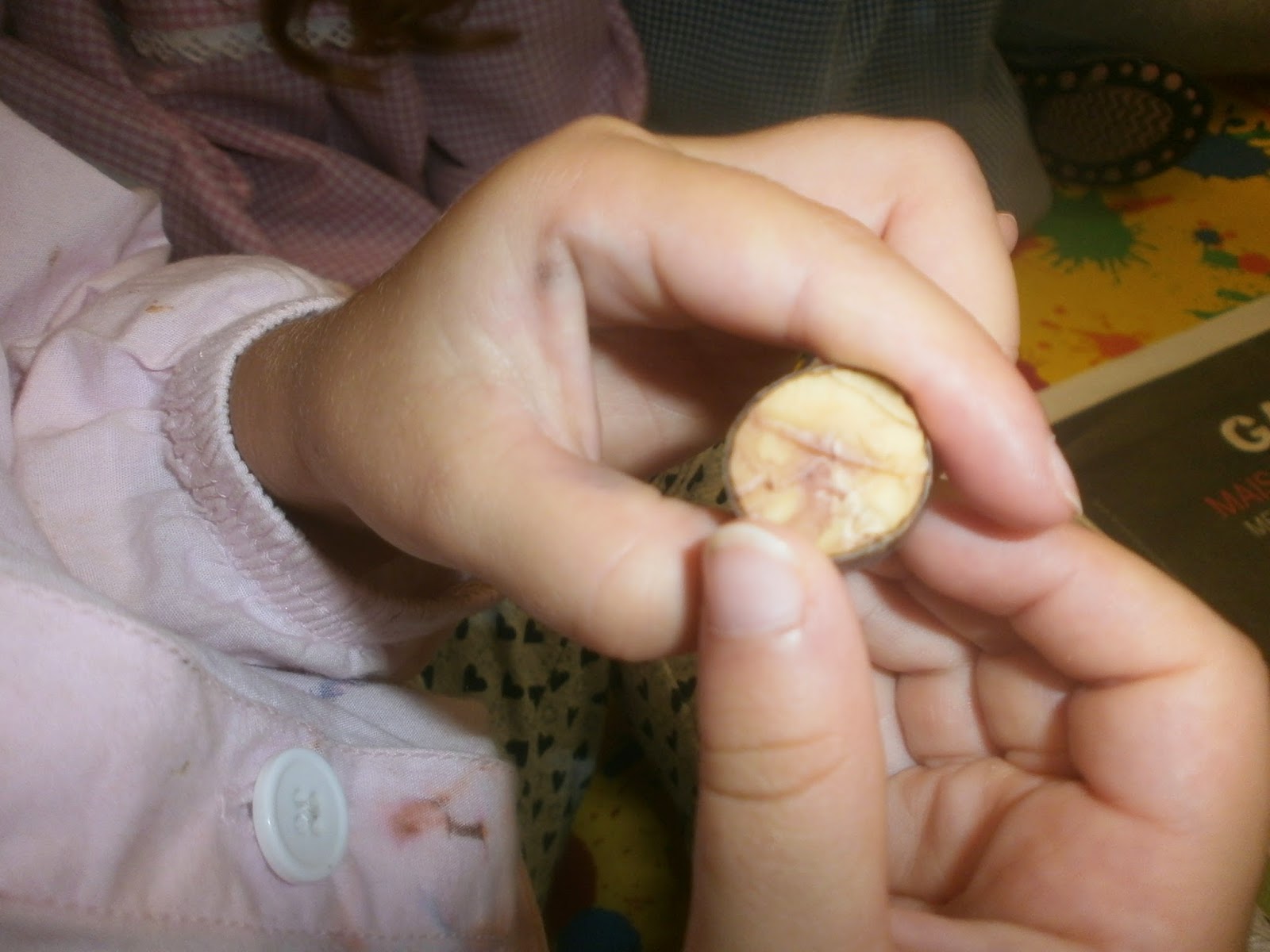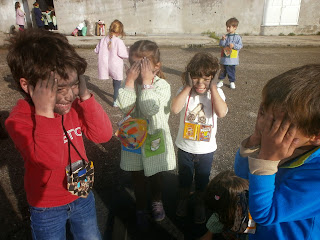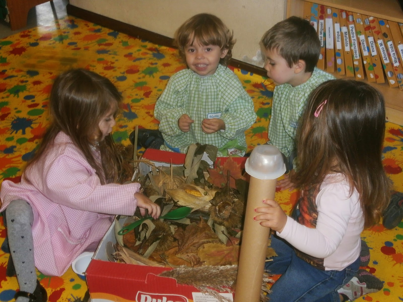 Os meninos mais pequeninos fizeram carimbagem com "bolas de milho", feitas com umas espigas que a avó do Rafael nos deu e que nós estivemos a tirar os grãos;