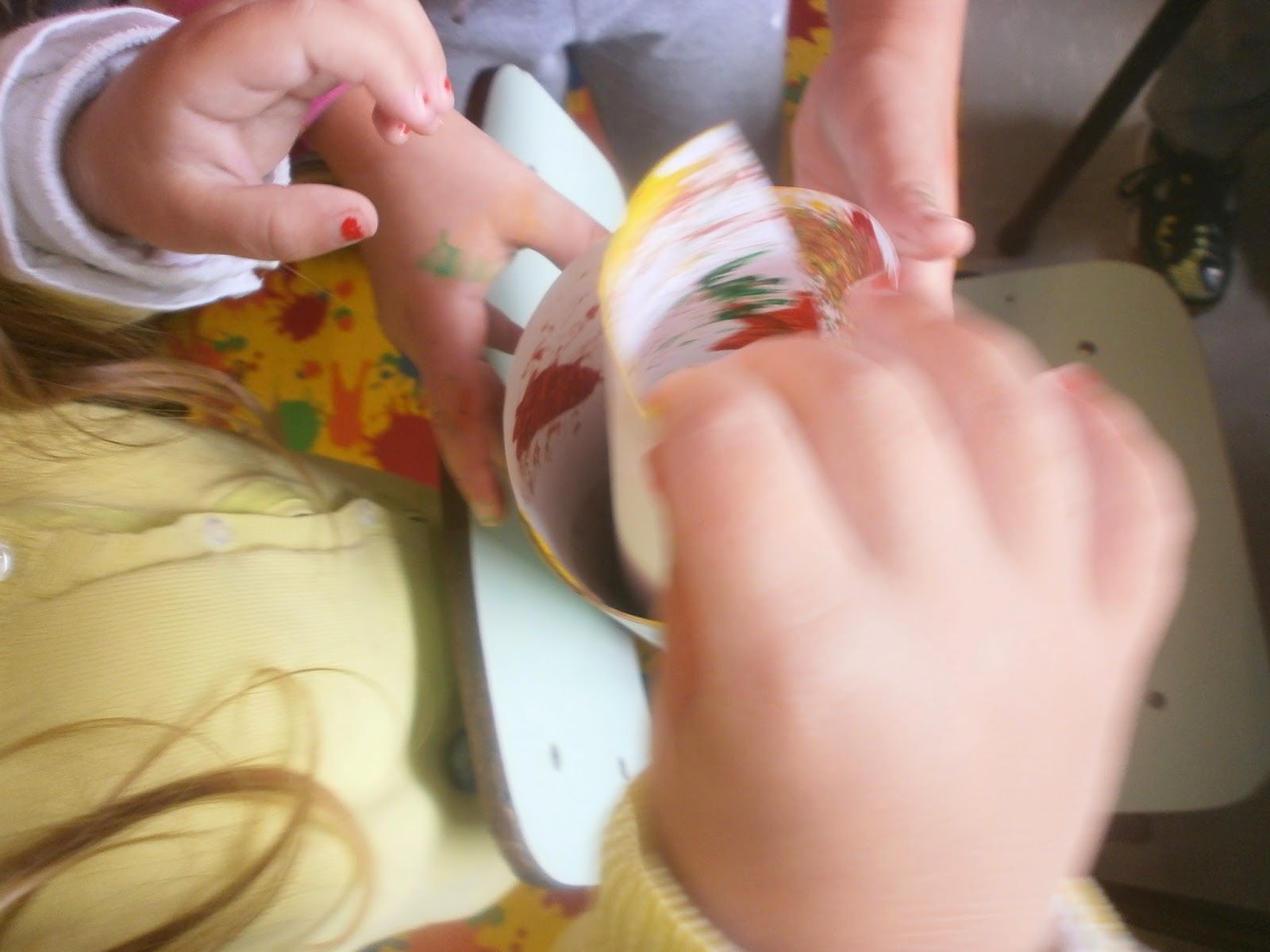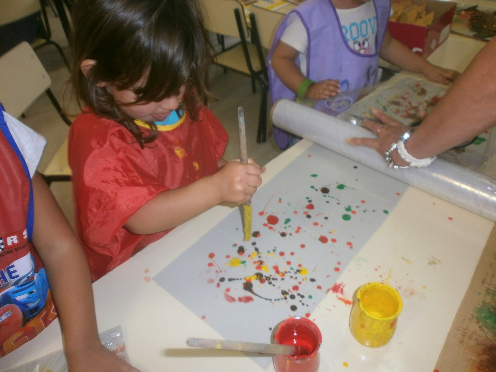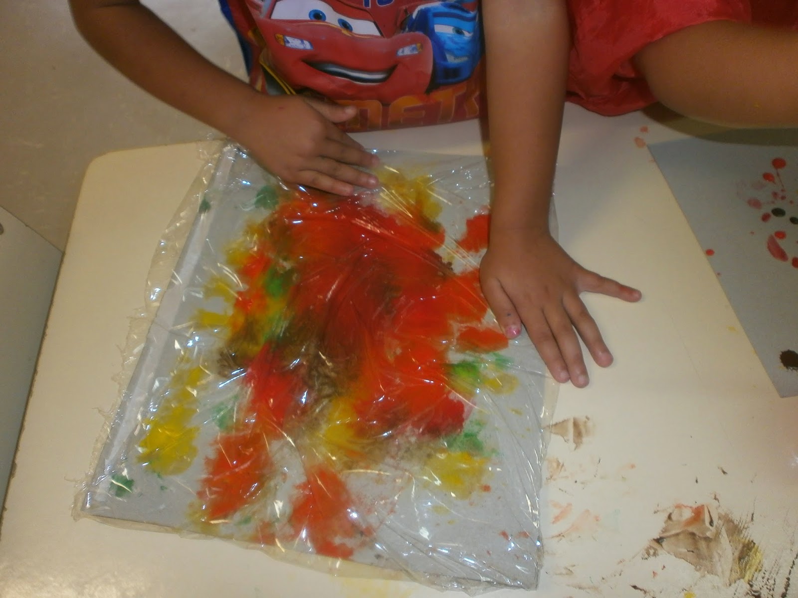 Os meninos mais pequeninos fizeram carimbagem com "bolas de milho", feitas com umas espigas que a avó do Rafael nos deu e que nós estivemos a tirar os grãos;