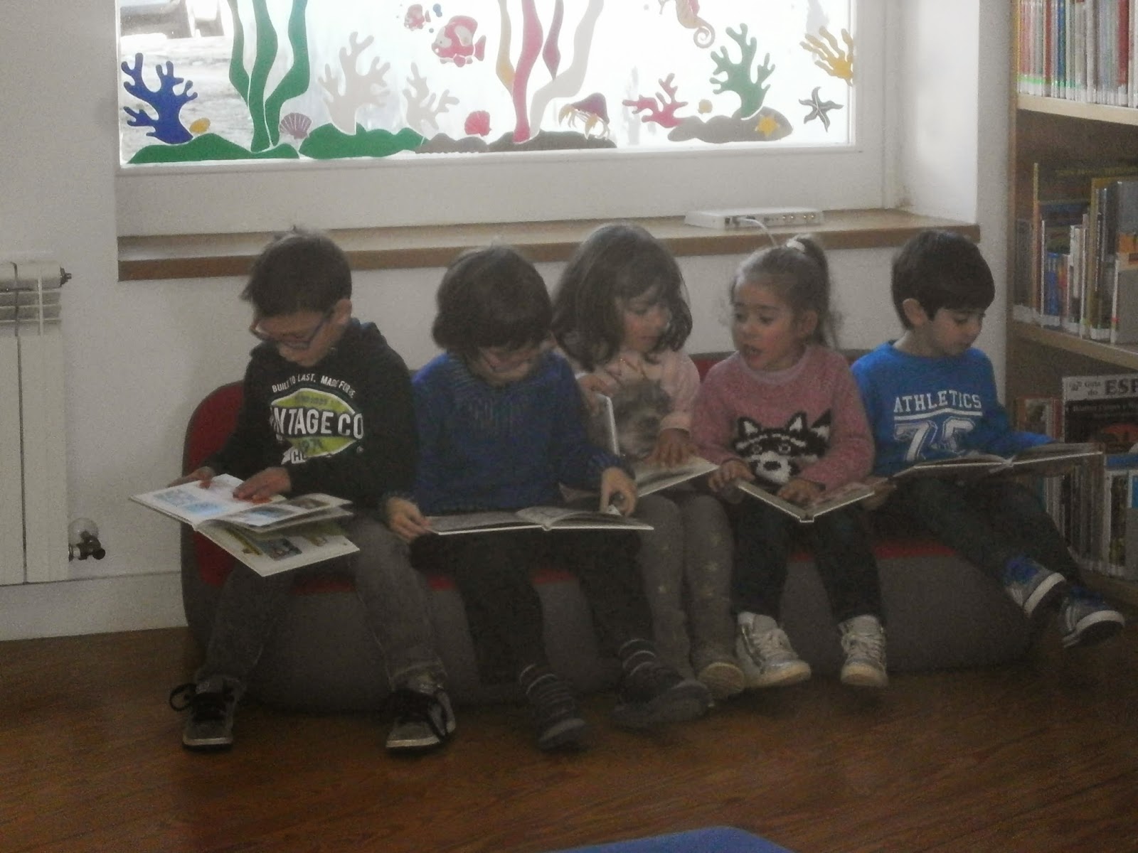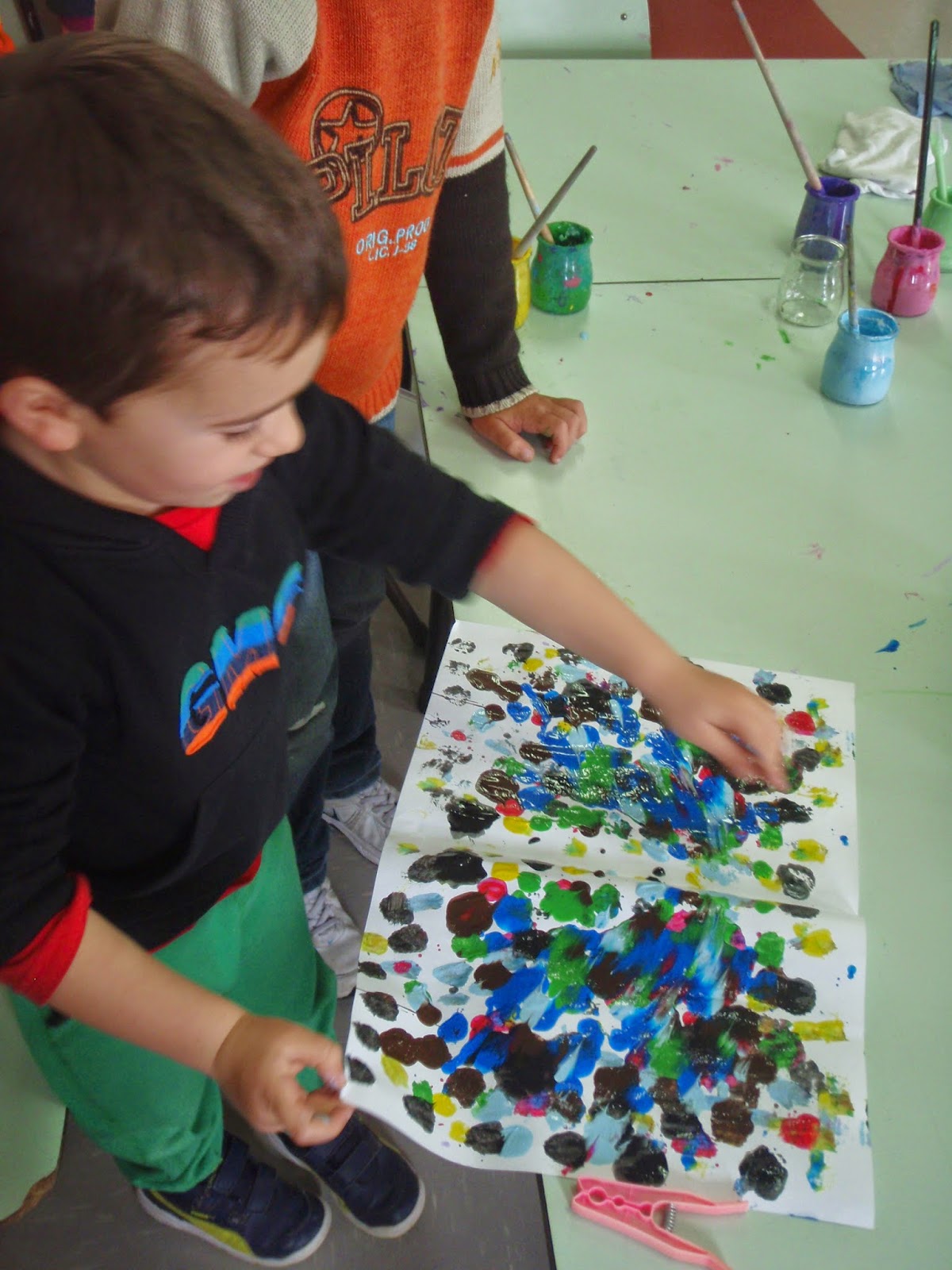 O Joaquim, há uns dias atrás, trouxe uma pintura que fez em casa. Explicou ao grupo que dobrou a folha ao meio e as pinturas de um lado transformaram-se em pinturas iguais àquelas.