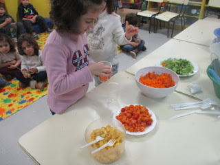 A pedido das crianças combinamos fazer ovos mexidos com alface, tomate e cenoura ralada.