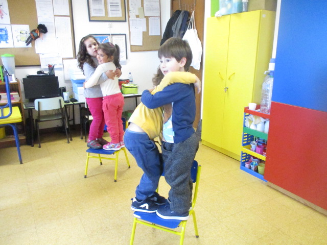 Para alcançarmos o objectivo, ao silêncio da pandeireta, tínhamos que subir a pares e ficar na cadeira equilibrados, ajudando o nosso par a subir e no final abraçando-o!