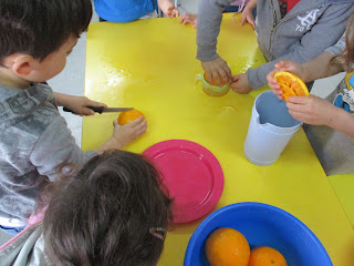 Com as laranjas que o João trouxe de casa, para partilhar com os amigos, fizemos sumo de laranja.